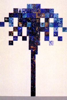 “青いヤシ”(正方形のペインティングを組み合わせてヤシの形を構成)